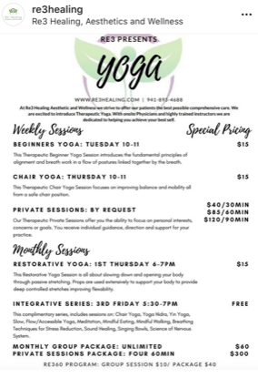 Check out our Q1 2020 Service Offerings for client, Re3 Healing + Aesthetics in Sarasota, FL. VP of Wellness Initiatives, Jelisa Difo, is spearheading a year to remember including a staff retreat, weekly classes and therapeutic private sessions, monthly open house and ongoing workshops and trainings.